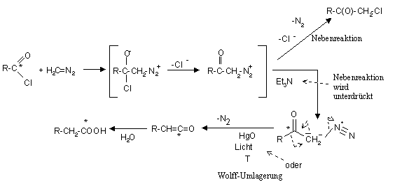 abgespalten. Das entstandene Carben lagert sich zum Keten um, das zur nächst höheren Carbonsäure hydrolysiert.